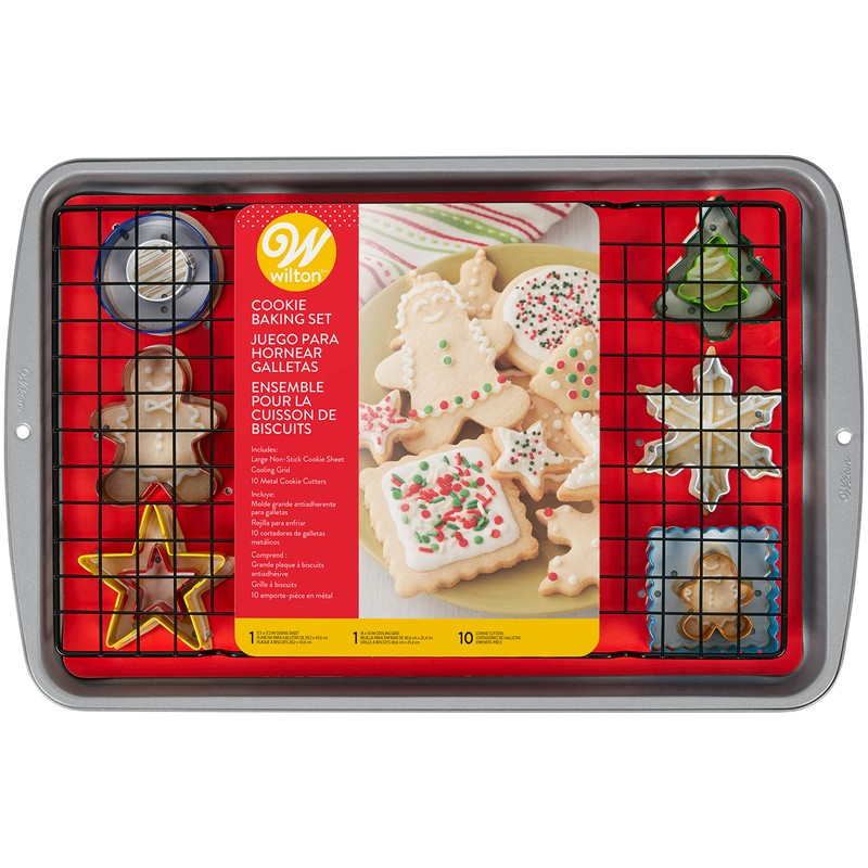 - Holiday baking set includes: 10 metal cookie cutters, cookie sheet and cooling grid