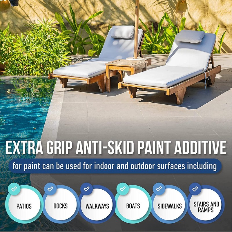 - Extra Grip non-slip paint additive can be used for indoor and outdoor surfaces, including patios, garage floors, driveways, sidewalks, walkways, stairs, and ramps. It will not change the color of your paint or coatings