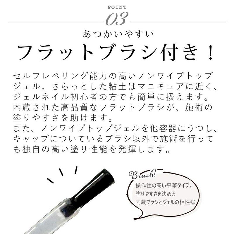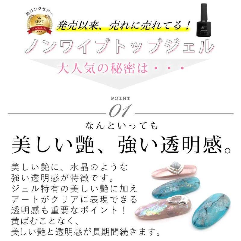 Professional Gel Nail Topcoat Non-wipe top gel means no wiping Top coat gel nail boasts a beautiful sheen. Cures with either LED or UV light. LED: 60 seconds ~, UV: 120 seconds ~