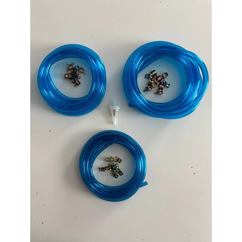 ITEM UP FOR SALE IS YOU GET 10 FT OF 1/8 IN HOLE  PRIMER HOSE VENT HOSE OIL HOSE + 10 CLAMPS + 10FT 1/4 HOLE FUEL LINE AND 10 HOSE CLAMPS + 10FT 3/16 HOLE FUEL LINE AND 10 HOSE CLAMPS AND ONE FUEL FILTER.FUEL LINE MADE OF SPECIAL FORMULATED VINYL THAT WAS TESTED WITH 15% METHANOL, -22 TO 195F TEMP, GOOD STUFF!!!!