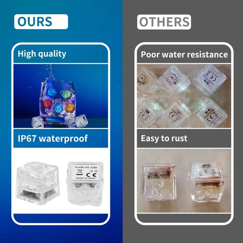 - COLORFUL CUBES Every light up cubes can change into 7 different colored within seconds. The ice cubes last up to 12 hours of battery life.