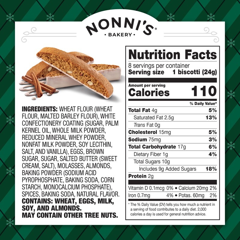 • Includes 2 boxes in Nonni's Gingerbread Biscotti. Each box contains 8 individually wrapped Nonni's Gingerbread Biscotti.