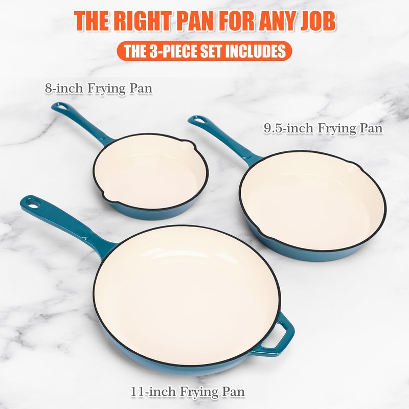 - 🔥【3-Piece Non-Stick Frying Pan Set】QuliMetal enameled cast iron cookware set includes 8-inch, 9.5-inch and 11-inch non-stick frying pans. The 8-inch small frying pan is suitable for frying eggs and omelets, the 9.5-inch frying pan is suitable for frying steaks, and the 11-inch large frying pan is suitable for family gatherings. This 3-piece frying pan set is ideal for home kitchens