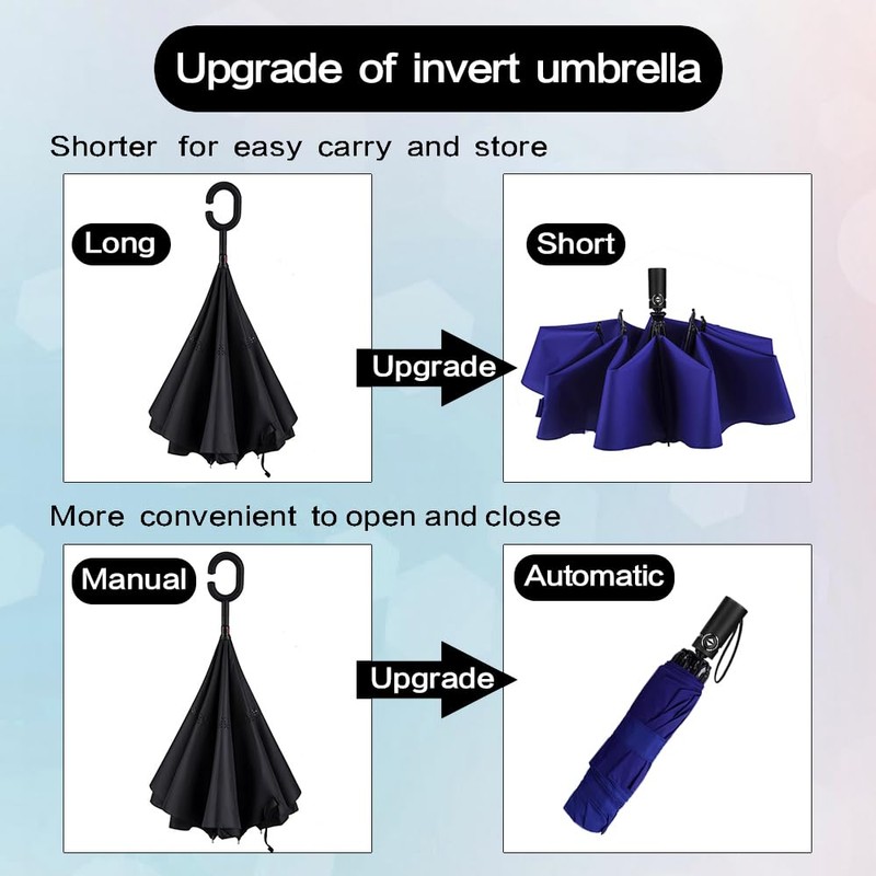 - UPGRADE REVERSE FOLDING DESIGN – Shorter and Easy Carry. This upside down umbrella folds the wet inside and the dry outside after use, prevents water from dripping, keeping you dry. Convenient to store in anywhere. Suitable for travel and daily use.