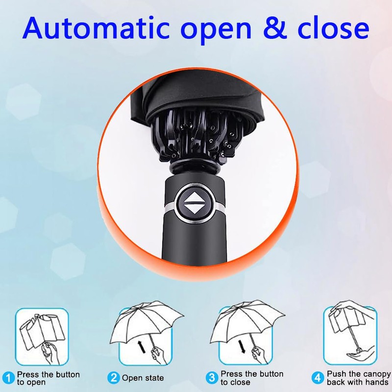 - AUTO OPEN/CLOSE BUTTON DESIGN - Fully automatic system for one hand design, perfect for one-hand operation. Simply OPEN or CLOSE the automatic umbrella with a press of a button in only 1s to give you quick rain protection when your another hand is catching or carrying something.