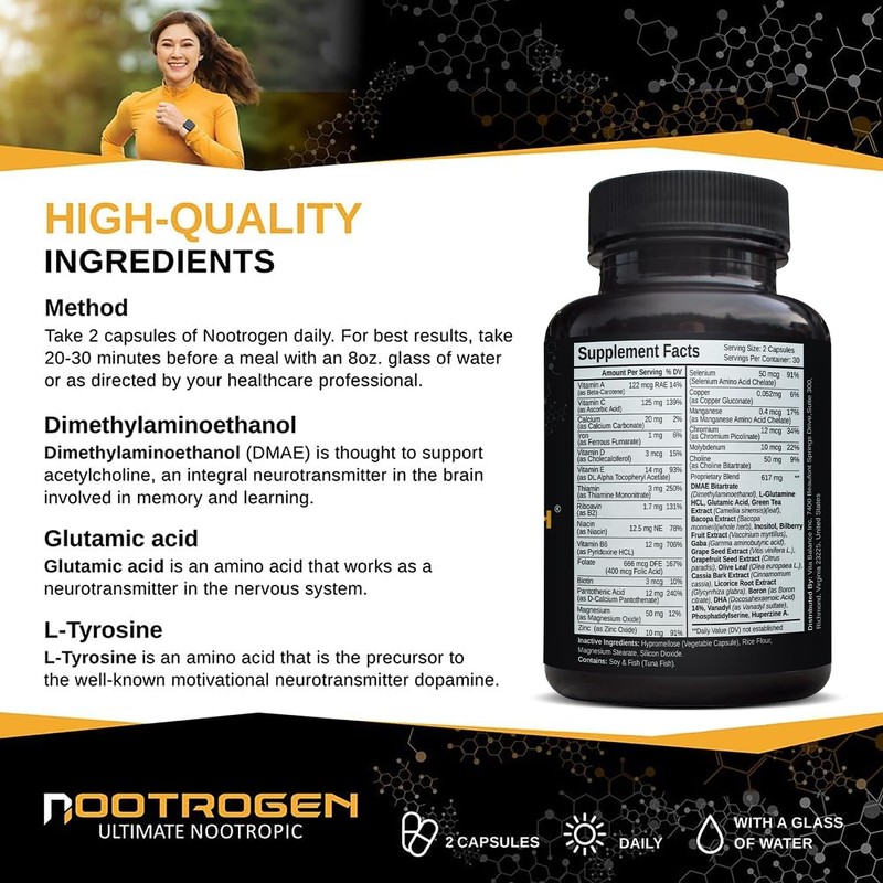 • Premium Quality Standards: When it comes to your health, don't take any risks on quality. Nootrogen is made in an FDA-registered facility that adheres to GMP guidelines. Each batch of this nootropic supplement undergoes rigorous testing to ensure both quality and purity. Buy with confidence knowing each bottle is exactly as it says.
