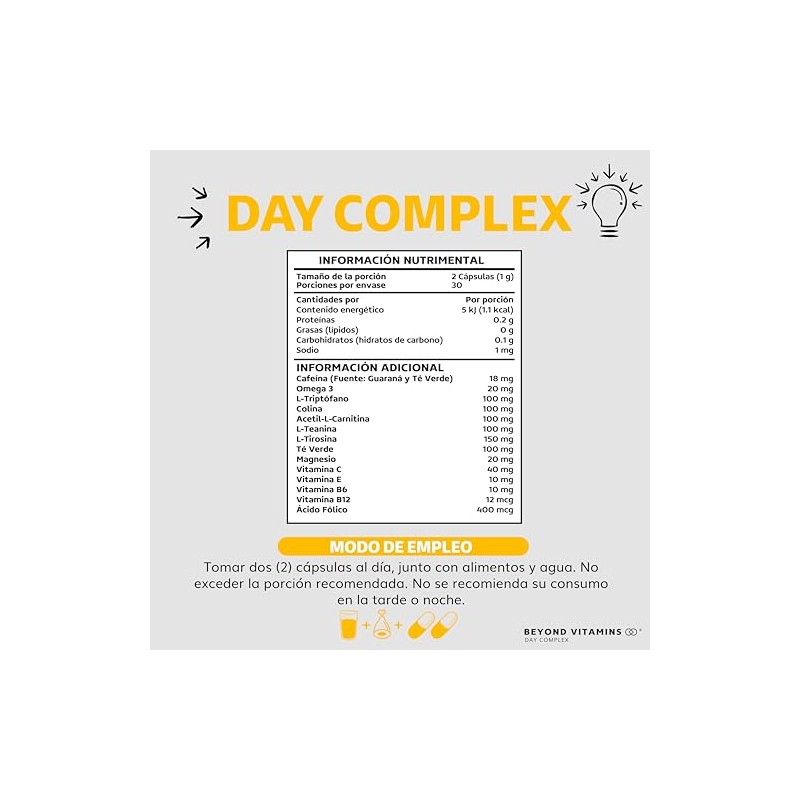 BEYOND VITAMINS - Nootropico Day Complex con Vitaminas, Minerales y Aminoácidos- Contiene Omega 3, L -Triptófano, Colina, Acetil L-Carnitina, L-Teanina- Suplemento Vitamínico - Suplemento Alimenticio en Cápsulas - Sin Azúcar-Ingredientes NON GMO-60 cápsulas. ⭐ Calidad premium certificada con excelentes reseñas. Materiales de alta gama y acabados premium. 🏆 Recomendado por expertos. Ideal para quienes buscan lo mejor en calidad y estilo. Producto auténtico con satisfacción total asegurada. ¡No te quedes sin el tuyo y aprovecha esta oportunidad única!