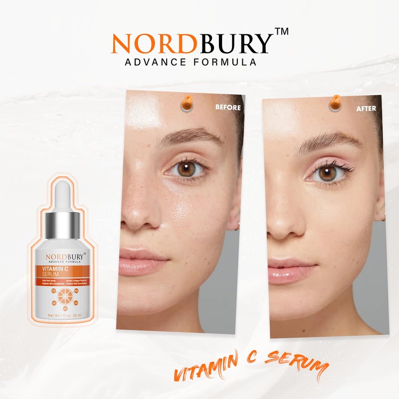 Nordbury Vitamin C Serum, Pure 20% Vitamin C with Vitamin E & Hyaluronic Acid for Face Day & Night, Brighten Skin Complexion Boost Collagen Production Fade Dark Spots Protects Skin from Radicals