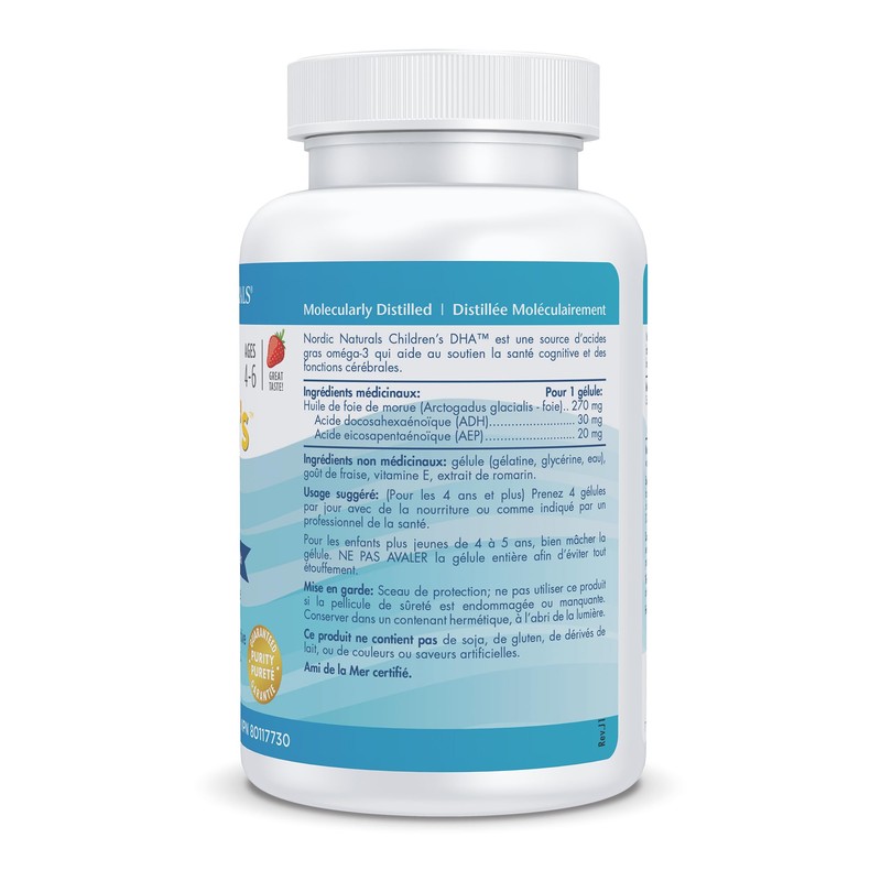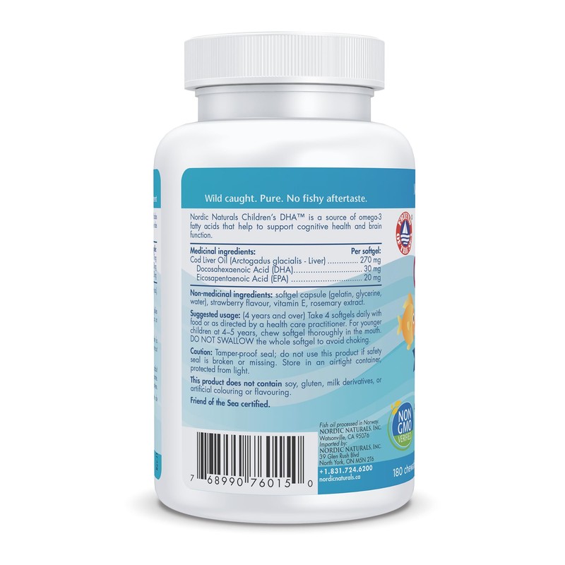 Kids everywhere love Nordic Naturals strawberry-flavoured Children's DHA. Made exclusively from our Gold Standard Arctic Cod Liver Oil, these products are rich in the omega-3 DHA, which is essential for brain function and the development of the brain, eyes, and nerves. Easily swallowed or chewed by children three years and older, Children's DHA also contains healthy levels of vitamins A and D. Proven Safe and Effective All our oils are purified of environmental toxins without chemicals or excessive heat, and surpass strict international standards for fish oil quality and safety. Exceptional Freshness Fresh fish oil means better results. Nordic Naturals oils are processed in an oxygen-free/nitrogen-rich environment utilizing proprietary technologies to ensure lowest oxidation and highest stability for superior freshness. Award-Winning Taste Since 1995, Nordic Naturals has received more than 50 awards for taste, product quality, and brand excellence. We've got omega-3s the whole family will love.