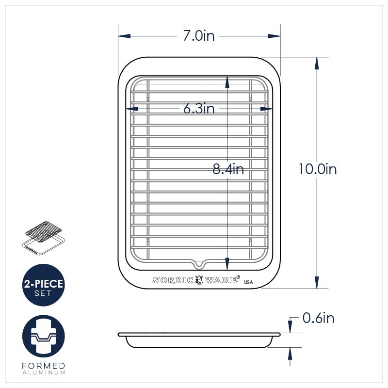• Measurements: pan exterior 10 x 7 x 0.6 inches and rack 8.4 x 6.3 x 0.6 inches