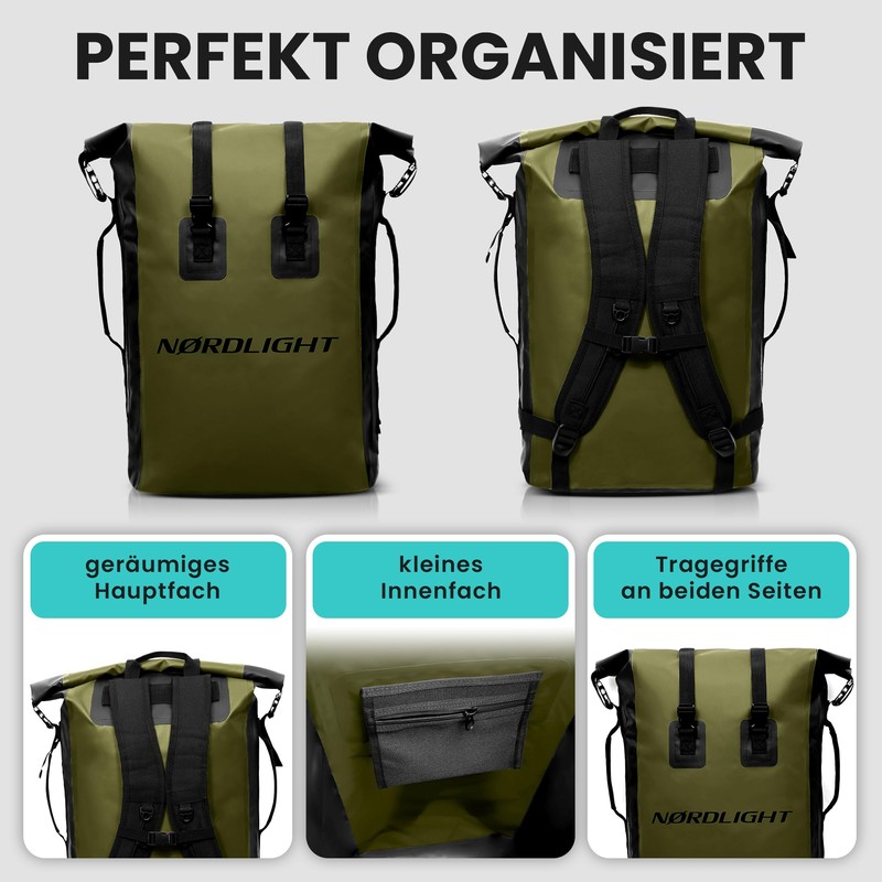 Nordlight Waterproof Backpack Dry Bag 35 L - (Olive Green) Roll Top Backpack with Padded Carry Strap, Waterproof Bag for Water Sports, Bicycle Backpack, Messenger Backpack, Trekking, Fishing