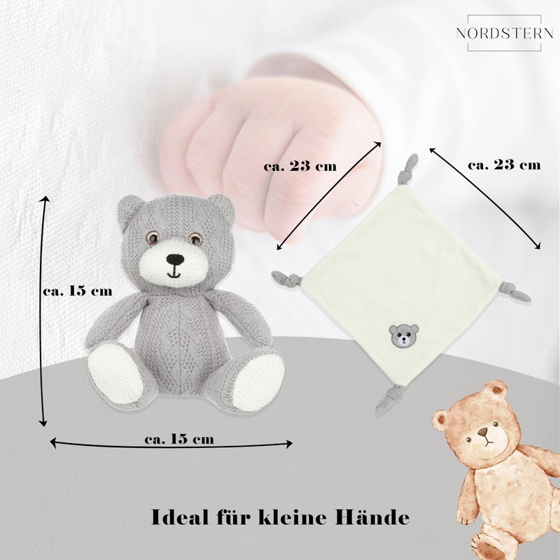 Our Nordstern cuddly bear and comforter is an ideal companion for your baby and toddler. With a size of approx. 15 x 15 cm (plush bear) and approx. 23 x 23 cm (comforter), this set offers the perfect combination of security and fun.