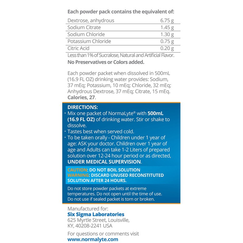 - RAPID DEHYDRATION RELIEF: NormaLyte Oral Rehydration Salts are scientifically formulated to quickly and effectively address dehydration resulting from chronic illnesses, diarrhea and vomiting.