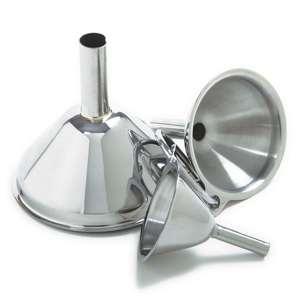 • Durable stainless steel construction funnels include three sizes, easy to clean, nest nicely and come with a clip-ring that keeps them together for storage.