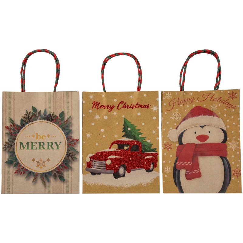 This bundle of bags is the perfect solution for all your holiday gift-giving needs. Each bag is thoughtfully designed to capture the enchanting spirit of Christmas, adding an extra touch of joy to your presents. Crafted from high-quality, sturdy paper, these gift bags offer durability and reliability, ensuring your gifts are safely and beautifully presented. The assorted set features a diverse range of festive designs such as holiday slogans, Santa, reindeer and snowmen. Spread holiday cheer and bring smiles to faces with these charming gift bags that perfectly showcase the magic of Christmas. Product Features:. Set of 20 paper gift bags. Assorted Christmas Designs. Attached sturdy handles. Mix of art paper and kraft paper. Kraft paper has a matte finish; art paper has a glossy coating 10-Piece Art paper bags Include:. (4) Small. (3) Medium. (2) Large. (1) XL 10-Piece Kraft paper bags Include:. (4) Small. (3) Medium. (2) Large. (1) XL Dimensions:. Small bag: 5.5"H x 4.5"W x 3"D. Medium bag: 8"H x 6"W x 3"D. Large bag: 11.5"H x 9.5"W x 4"D. X-Large bag: 14.5"H x 11.5"W x 4.5"D Material(s): paper