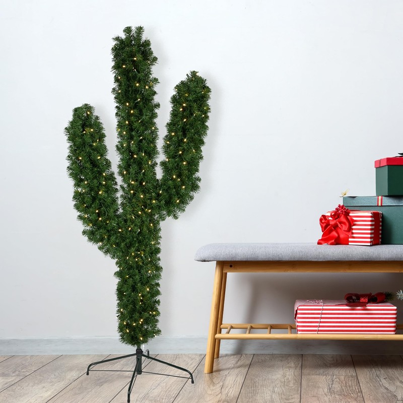 Looking for an extraordinary Christmas tree? Then look no further than the newest design in our Christmas trees, this pre-lit Christmas cactus tree! Shaped just like a cactus right from the dessert, only it is designed with green pine. It takes up minimal space and is perfect for any area of your home or office. Your family and friends will rave about your style because of your choice in picking this unique Christmas tree. Pre-strung with warm clear LED lights, it adds a warm glow to your holiday decor while making set up a breeze. Product Features:. Pre-lit with 140 warm clear LED lights. "Warm clear" also known as "warm white" has a soft incandescent glow, similar to candlelight. Bulb size: concave wide angle. Bulb type: LED. 35” green lead cord Additional Product Features:. LED lights use 90% less energy. Durable non-glass replaceable bulbs. Bulbs stay cool to the touch. Light sets on tree are UL certified and approved for indoor or outdoor use, however the tree itself is recommended for indoor use only. If one bulb burns out, the rest will stay lit. Lights are equipped with Lamp Lock feature, which makes them replaceable, interchangeable and keeps them from falling out. 4-piece easy assembly (including stand). Comes with replacement bulbs and spare fuses. Comes with a FREE green metal tree stand. Wire gauge:22. 120 volts, 60 hertz, .024 amps, 2.88 watts Dimensions: 6’H x 32"W x 6"D (from the base of the stand to the top of the tree). Distance from floor to the first row of branches: 8”. Stand: 24" wide Material(s): PVC/metal/plastic bulbs/wire Branches are compressed for shipment and need to be fluffed out upon arrival to look like the photo.