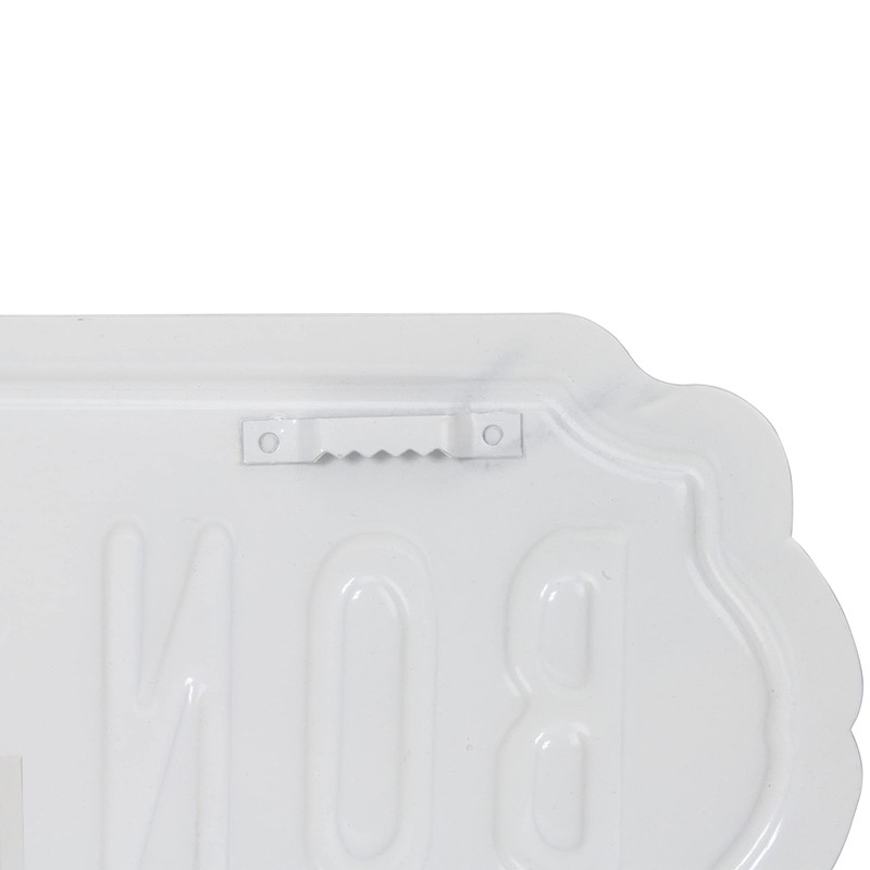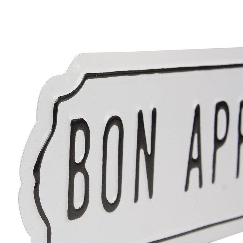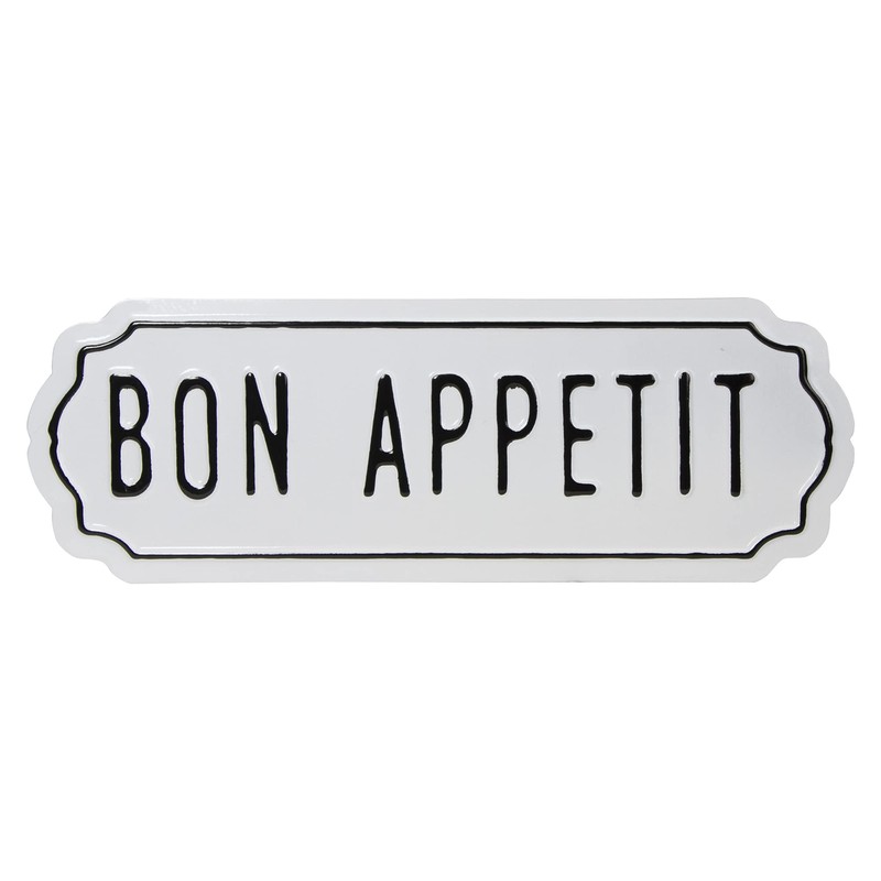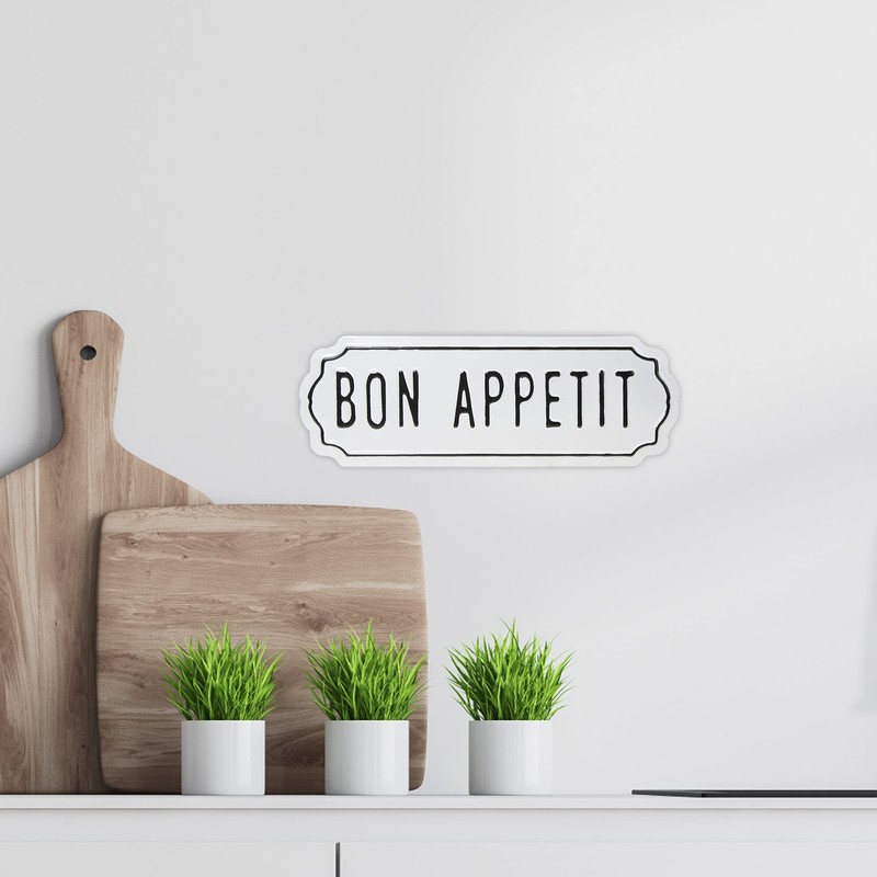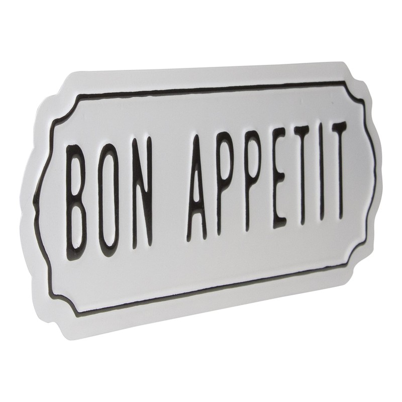 Welcome family and friends to dinner with this "BON APPETIT" metal plaque, designed to last for many years to come. A perfect wall display for kitchens and family restaurants letting patrons know to bring their appetite. It also makes a great housewarming gift for your family and friends or that chef in your life. Features:. Kitchen and dining room metal wall plaque. Embossed with "BON APPETIT" in black text. White background with black letters and lined borders. Ready to hang with 2 sawtooth hangers on the back. Recommended for indoor use only Dimensions: 4.75" high x 13.75" wide. Material(s): metal