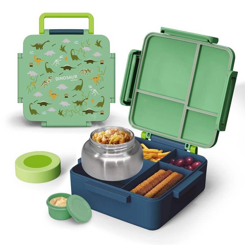 - LEAK-PROOF BENNY BOX: The kids insulated lunch box features a laminated technology individually sealed lid with silicone rubber gaskets in each compartment, 100% leak-proof and sealed to keep food fresh and prevent any spills, stains/odors. The sealing rubber ring on the lid of the thermos ensures 100% leak-proof. You can add yogurt, sauces or other liquids to your child's lunch and the food won't leak even if you shake the lunch box like crazy.