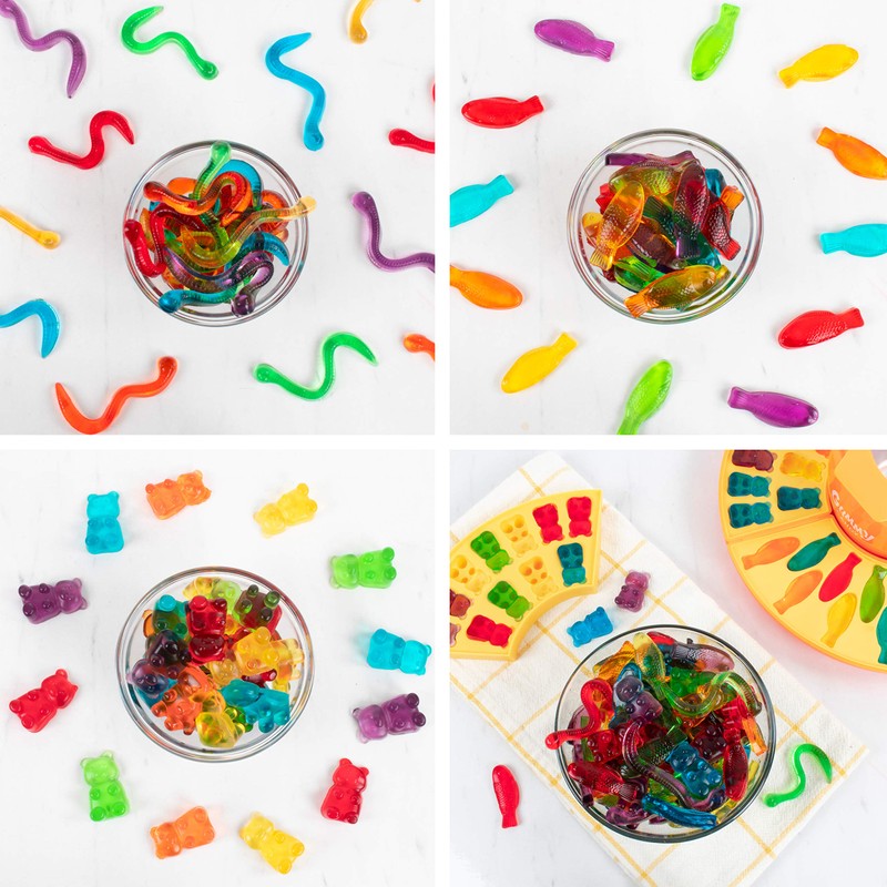 • Make fish, worm and small bear gummy candies with the easy to use silicone molds