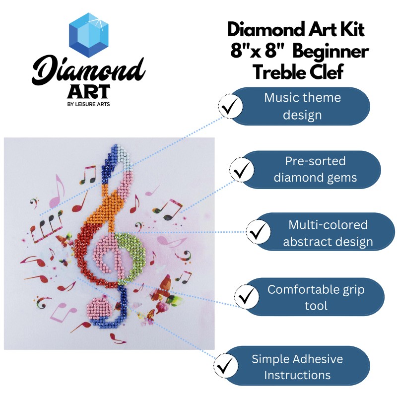 Diamond Art Kit Start diamond painting with Diamond Art by Leisure Arts, powered by Diamond Dotz! Paint with beautiful 13 faceted diamonds onto high quality color printed fabric. Kit contains: high quality printed canvas, stylus, craft tray, wax piece, comfort grip, pre-sorted diamond art gems, and easy to follow instructions. Beginner 8"x 8" Treble Clef- Compose a melody of colorful gems when you dazzle this artistic treble clef diamond painting. You don't have to be musically inclined to appreciate these shining green and blue gems. Canvas measures approximately 10.63"x 10.63". 0.22oz pre-sorted diamond art gems. For ages 13 and up. Conforms to EN71-3 Conforms to ASTM D-4236.