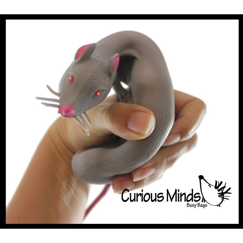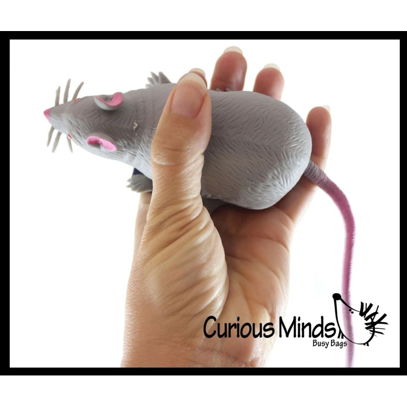 INCLUDES 1 RAT - These gross rat stress toys are so fun to manipulate. The pets are filled with a fine granular almost sand-like filling surrounded by a soft and stretchy silicone shell. The critter is super soft and slightly weighted and has a sand filling inside that add to the sensory experience. The sand grit make a quiet crunch like sound when they are squeezed. This makes the animal irresistible since you can squeeze, poke, pull, stretch and bend it! Smash it flat and bring it back to its original shape. Each mouse can be squeezed and stretched! This soft mouse body is 46" long x 2" tall and 2" thick when unstretched. It has a 6" stretchy tail.