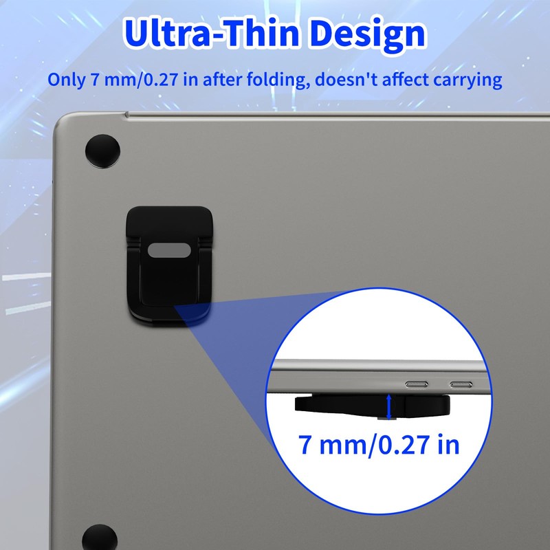 - Compact Design: This foldable laptop stand measures just 7 mm thick when collapsed, making it a perfect travel accessory that fits seamlessly into your laptop bag without adding bulk