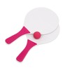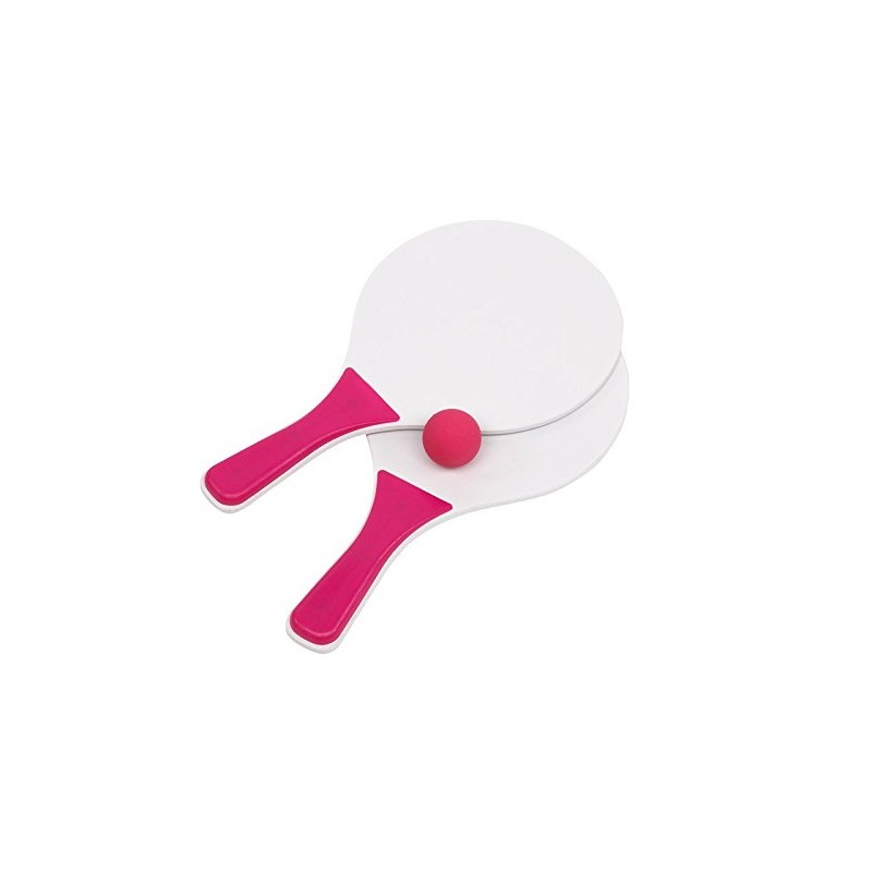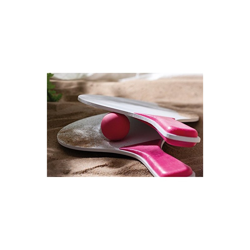 - The great beach game set has two wooden rackets with contrasting colours, as well as a softball. The set is delivered in a practical mesh bag.