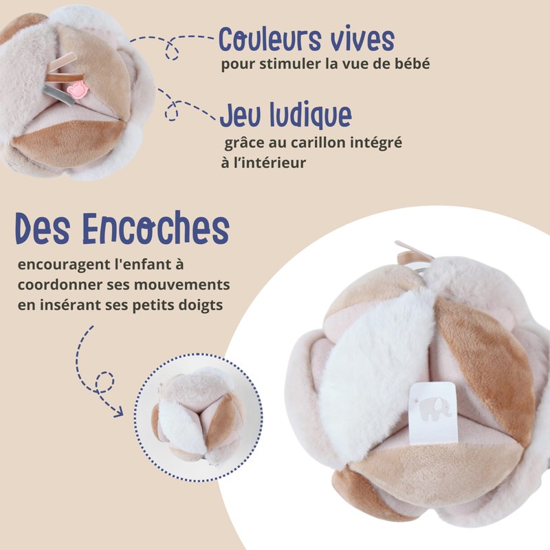 - Stimulation of the senses: the bright colours of the ball stimulate vision. Inside, a wind chime adds a playful touch.