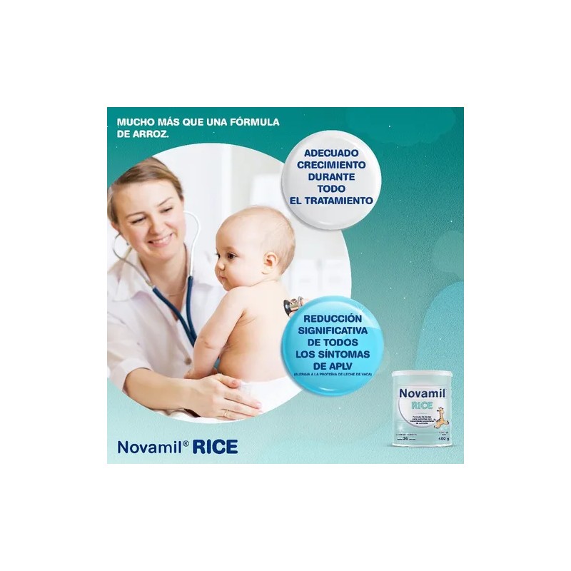 "NOVAMIL RICE Es una FÓRMULA Infantil NO LÁCTEA para lactantes con necesidades especiales de nutrición, a partir del nacimiento y hasta los 36 meses de edad con PROTEÍNA DE ARROZ HIDROLIZADA.