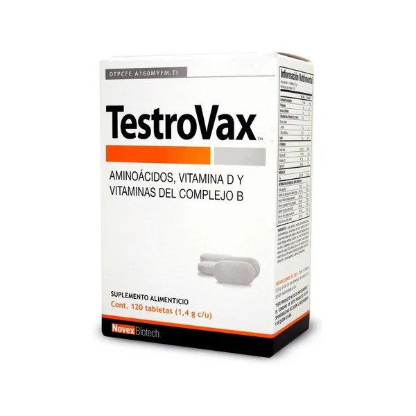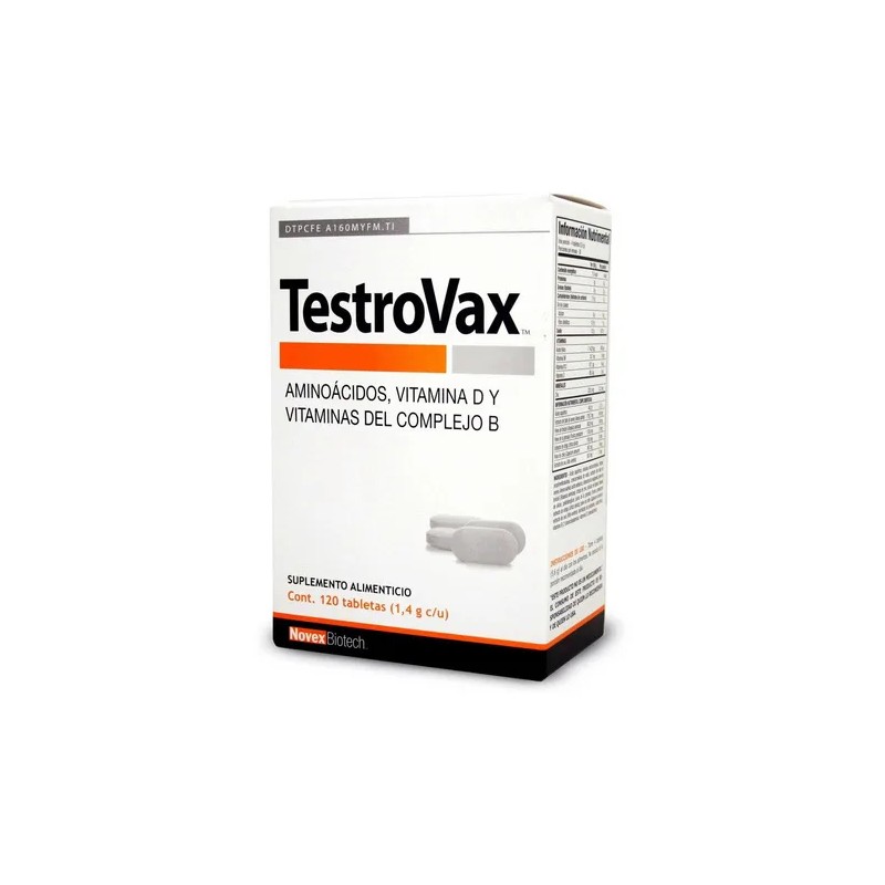 Novex Biotech Testrovax es un suplemento en tabletas, sin sabor, formulado para complementar dietas insuficientes y apoyar el bienestar masculino. Cada envase contiene 120 tabletas, ideal para incluir en rutinas prolongadas.