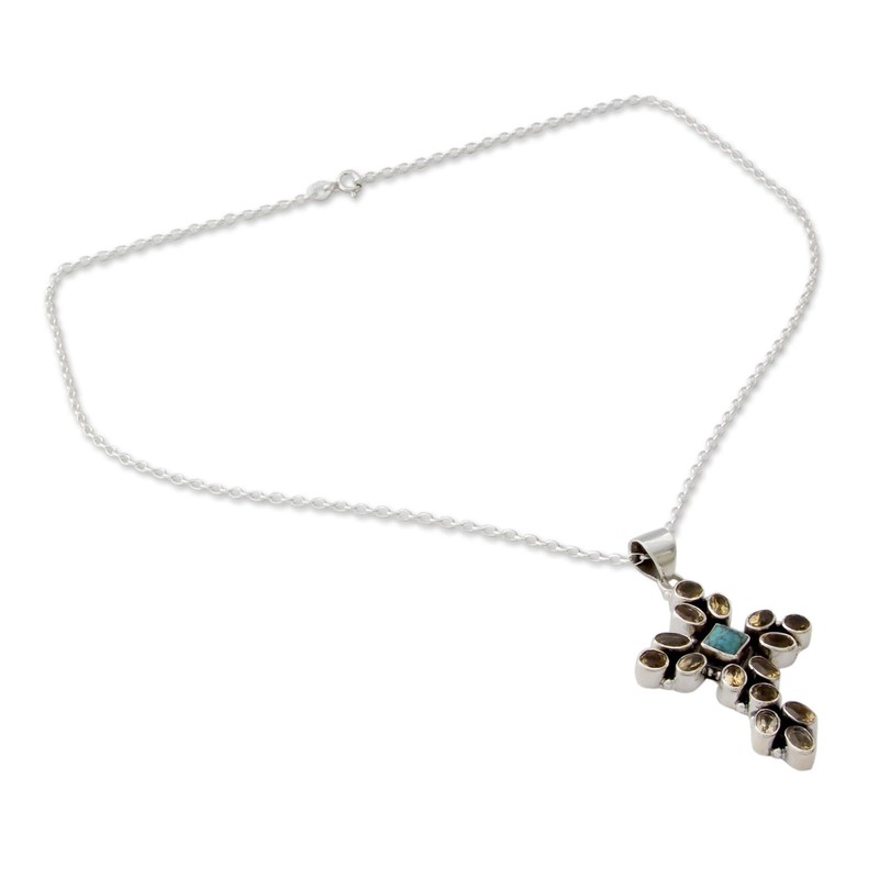 NOVICA Artisan Handmade Citrine Pendant Necklace Sterling Silver with Cross Reconstituted Turquoise Yellow India Buttercup Christian Gemstone Spiritual Religious [18 in L 2 mm W Pendant(s) 2 in L x 1]