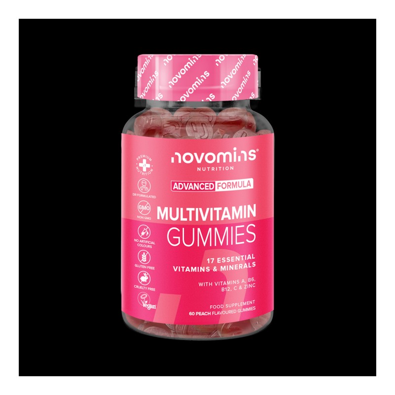 Support your health with Novomins Multivitamin Gummies—grown by nature, blended by science. Each delicious peach-flavoured gummies. Approved by the Vegan Society, they are halal, gluten-free, and free from artificial colours and preservatives.