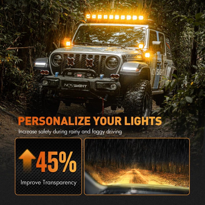 【Waterproof and Durable Construction】Designed with an IP68 waterproof rating, NOVSIGHT pod lights are built to withstand harsh conditions, ensuring reliability during all your off-road challenges.