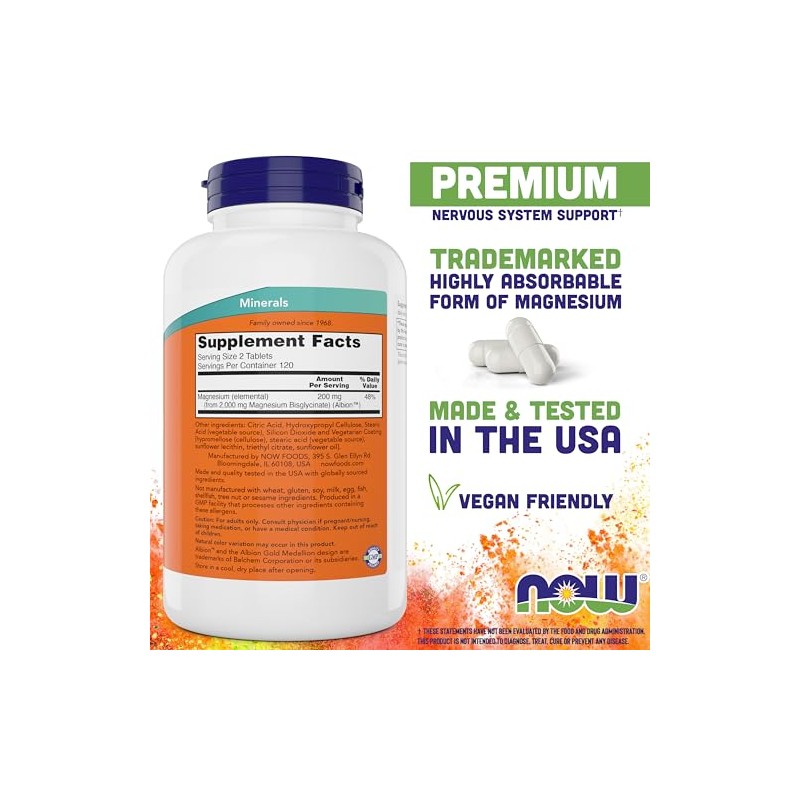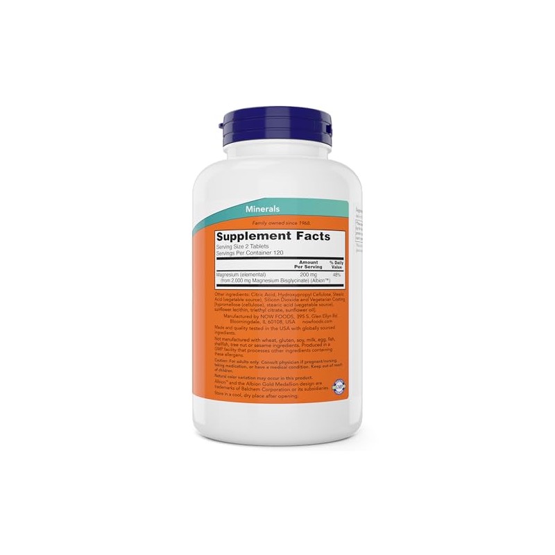 NowFoods Magnesium Glycinate, 240 Count (Pack of 2) - Supports Healthy Muscle and Nerve Functions - Non-GMOSupplement for Women and MenPREMIUM VERSION OF Magnesium glycinate which utilizes magnesium bound to the amino acid glycine, which facilitates intestinal absorption.* Magnesium is a mineral that is critical for energy production, muscle contraction, and nerve impulse transmission.* Among the processes that require magnesium are protein production.*Superior Manufacturing GMP Quality AssuredSUGGESTED USAGE: Take 2 tablets 1 to 2 times daily with food.NOW FOODS - TRUSTED FOR OVER 50 YEARS Founded in 1968 to provide top-quality, affordable vitamins and health foods Family Owned Based in the heartland of the Midwest Manufactured in the USA Tested for purity by Now's team of 150+ quality-control professionals. Over 10,000 lab tests performed each month.Add to your cart today because you deserve the best life.MAKE THE SMART CHOICE Vegan / Vegetarian Non-GMO Not manufactured with wheat, gluten, soy, milk, egg, fish, shellfish, tree nut or sesame ingredients. Produced in a GMP facility that processes other ingredients containing these allergens.