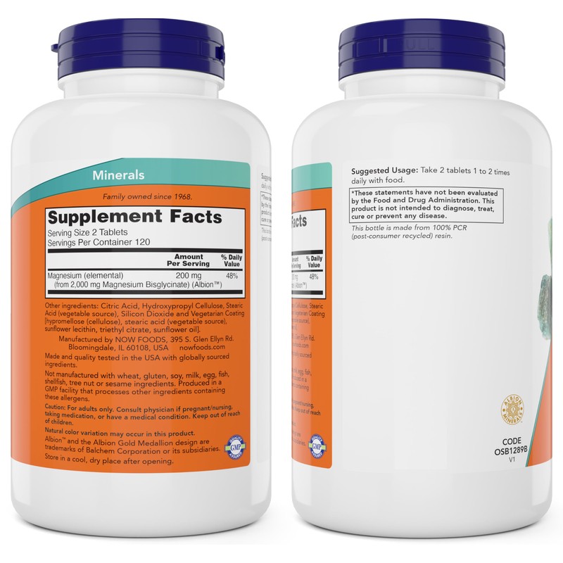 NowFoods Magnesium Glycinate, 240 Count - Supports Healthy Muscle and Nerve Functions - Non-GMOSupplement for Women and MenPREMIUM VERSION OF Magnesium glycinate which utilizes magnesium bound to the amino acid glycine, which facilitates intestinal absorption.* Magnesium is a mineral that is critical for energy production, muscle contraction, and nerve impulse transmission.* Among the processes that require magnesium are protein production.*SUGGESTED USAGE: Take 2 tablets 1 to 2 times daily with food.NOW FOODS - TRUSTED FOR OVER 50 YEARS Founded in 1968 to provide top-quality, affordable vitamins and health foods Family Owned Based in the heartland of the Midwest Manufactured in the USA Tested for purity by Now's team of 150+ quality-control professionals. Over 10,000 lab tests performed each month.Add to your cart today because you deserve the best life.MAKE THE SMART CHOICE Vegan / Vegetarian Non-GMO Not manufactured with wheat, gluten, soy, milk, egg, fish, shellfish, tree nut or sesame ingredients. Produced in a GMP facility that processes other ingredients containing these allergens.