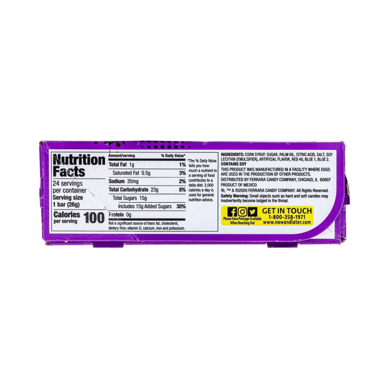 Indulge in the delicious grape flavor of Now & Later Changemakers Bars with this pack of 24. Perfect for Christmas or any occasion, each bar is individually packaged for easy sharing and convenience. With 6 pieces in each pack, these bars are a great addition to any pantry and are sure to satisfy your sweet tooth. Enjoy the chewy texture and long-lasting flavor of Now & Later.