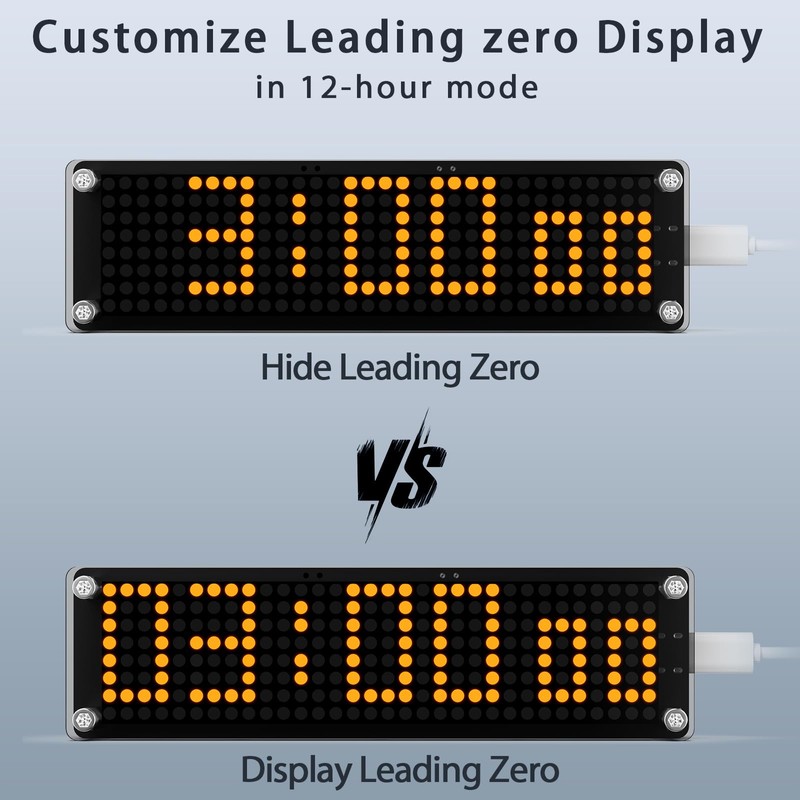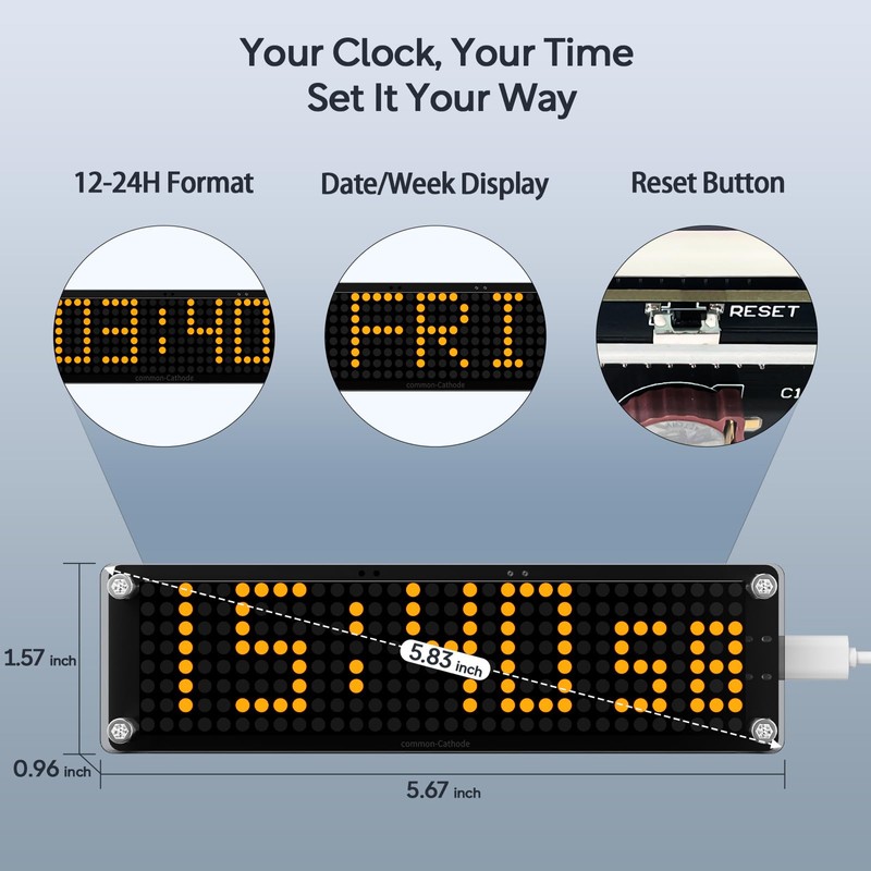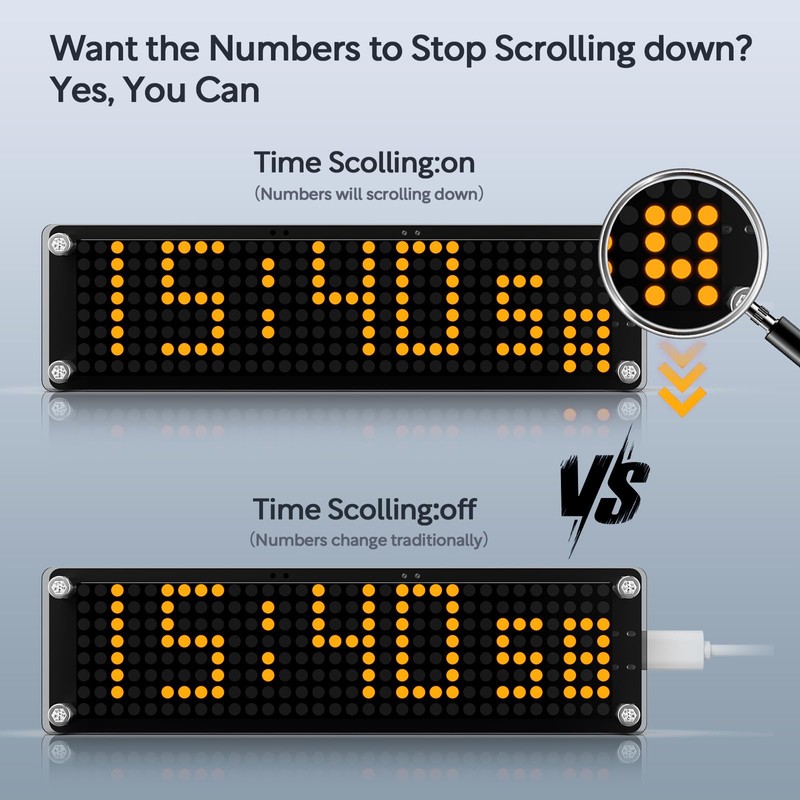 • Dynamic LED Matrix & Scrolling Display Mode: Switch between dot matrix clock precision and a mesmerizing downward scrolling LED matrix display. Hide the seconds clock for minimalism or showcase it for real-time tracking. Ideal for digital desk clock enthusiasts or tech gadgets lovers seeking a cool digital gadget with programmable LED desk display time.