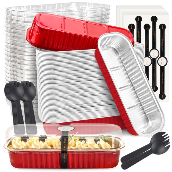 NPLUX Mini Loaf Pans with Lids and Spoons Rectangular Aluminum Foil Baking Pans Mini Cheesecake Containers 6.8oz(60 Pack, Red)