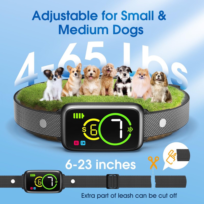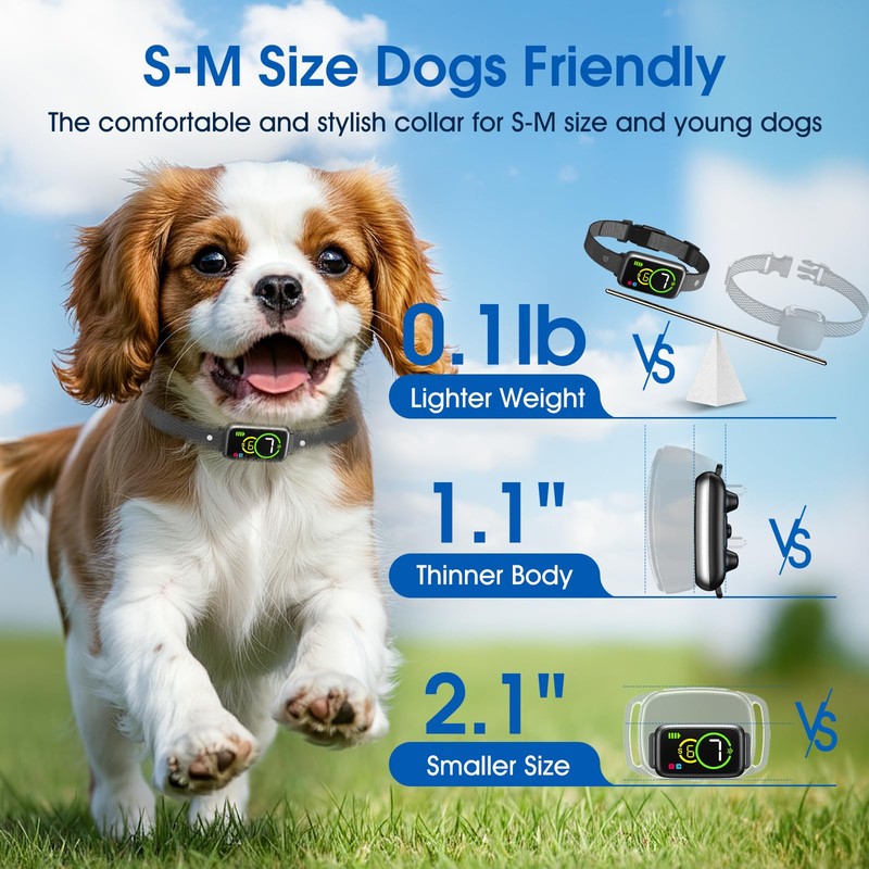 - 【PERFECT FOR S-M SIZE DOGS, SMALLER, THINNER, LIGHTER AND MORE CHIC】 The small dog bark collar is designed for small, medium size dogs. The dog bark collars for small dogs is lightweight and compact in itself, ensuring that small dogs can wear it comfortably without any burden. The adjustable strap is made of 600D heavy-duty nylon, which is softer and more durable. This stop bark collar is suitable for dogs weighing between 4 and 65 pounds and with a neck size of 6 to 23 inches. Besides, its stylish appearance serves as a great decoration, making your dog stylish and stand out