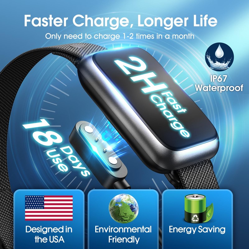 - 【CHARGES fAST AND LAST】Featuring exclusive Flashsec charging technology, the barking collar for dogs can be fully charged within 1 to 2 hours. The upgraded battery effectively extends the standby time to 18 days. You only need to charge it 1 to 2 times a month, which is more convenient and energy-efficient. In addition, this small dog bark collar adopts magnetic charging, providing better waterproof performance. The IP67 waterproof bark collar for small dogs 5-15 lbs allows you to train your dog by the pool, on the beach, by the sea, and even on rainy days