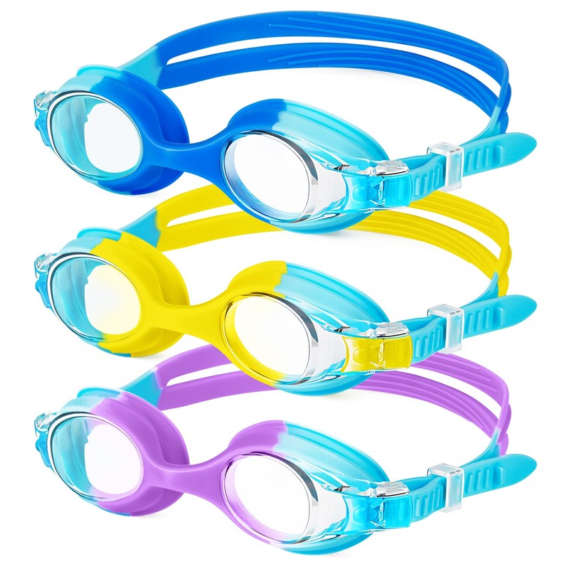 - [EASY ADJUSTMENT] The swimming goggles Quick adjustment strap can be easily adjusted by child or parent. Simply pull the strap to the right length. The elastic headband stretches strongly without breaking, perfect for most kids' heads. The non-slip strap ensures that the kids goggles swimming stay in place during swimming. Designed swim goggles kids 3-8 feature child safety features and a variety of fun tie-dye colours that will help your child start their swimming adventures right.