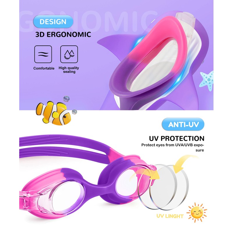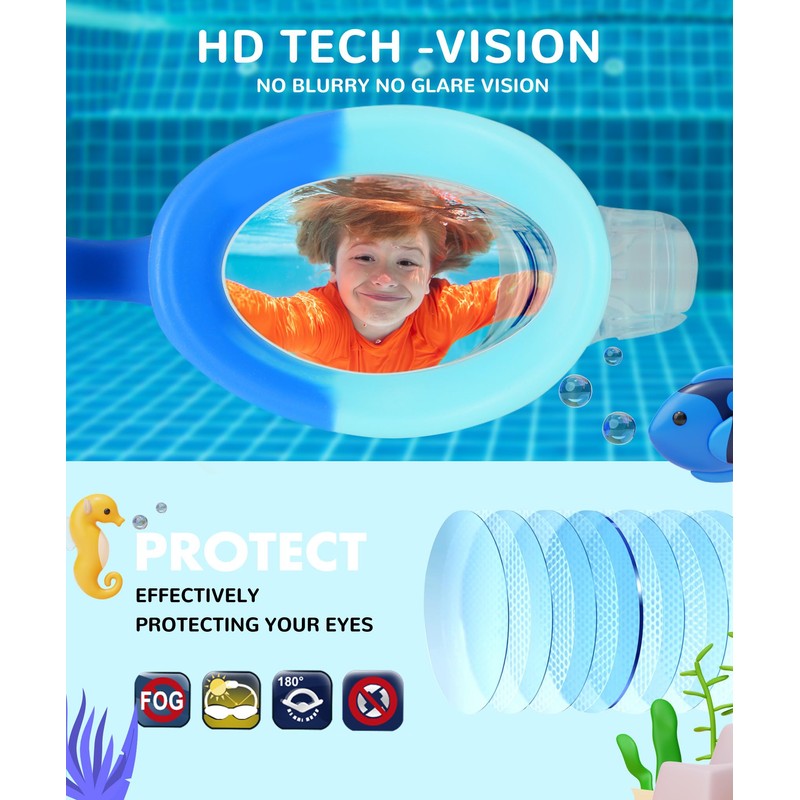- [ANTI-FOG & UV PROTECTION] The inner lenses of the swim goggles feature the latest anti-fog treatment, allowing children and teens to see underwater without blurring or distortion. The outer surface coating with UVA/UVB protection filters out irregular light and avoids glare, which protects their eyes from sunlight and harmful glare. Perfect for boys' and girls' swimming lessons to stimulate their interest in swimming.