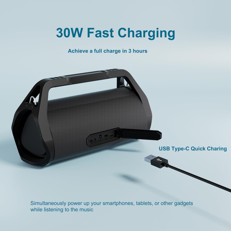 - 20 Hours Playtime and Built-in Power Bank: 30W fast charging technology (11.1v input); Built-in AUX/Micro SD/USB and Microphone input for computers, smartphones or tablets, music players, etc..