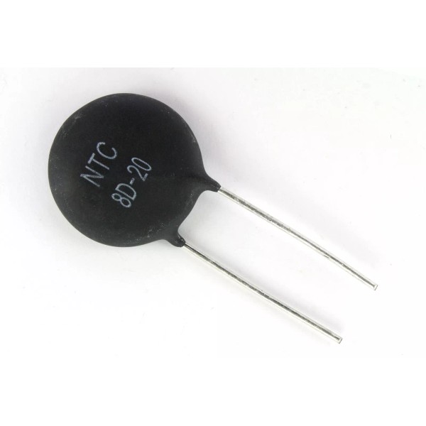 The 8D-20 Power NTC Thermistors provide inrush current suppression for sensitive electronics. Connecting a 8D-20 in series with the power source will limit the current surges typically created at turn on. Once the circuit is energized the resistance of the 8D-20 will decrease rapidly to a very low value, power consumption can be ignored and there will be no effect on normal operating current. Using the 8D-20 Power NTC Thermistor is a most cost-effective way to curb surge current and protect sensitive electronics from damage.