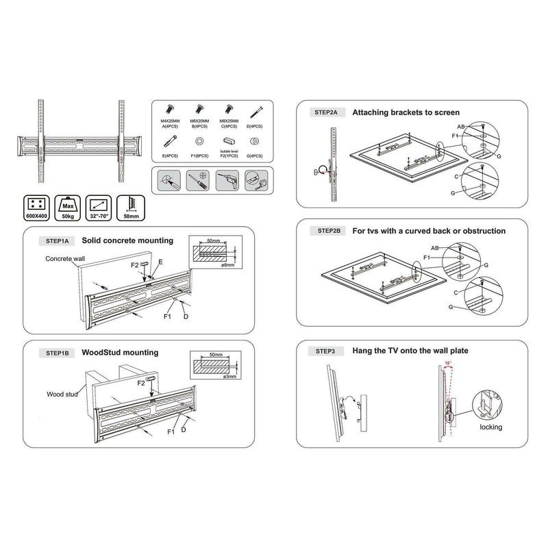 - Fits VESA mounting hole patterns : 600mm x 400mm max 600x400/400x400/400x200/200x200/400x300/300x300/300x200/200x100mm/100x100mm