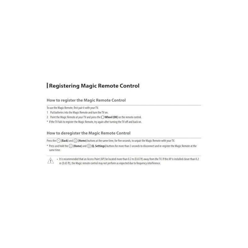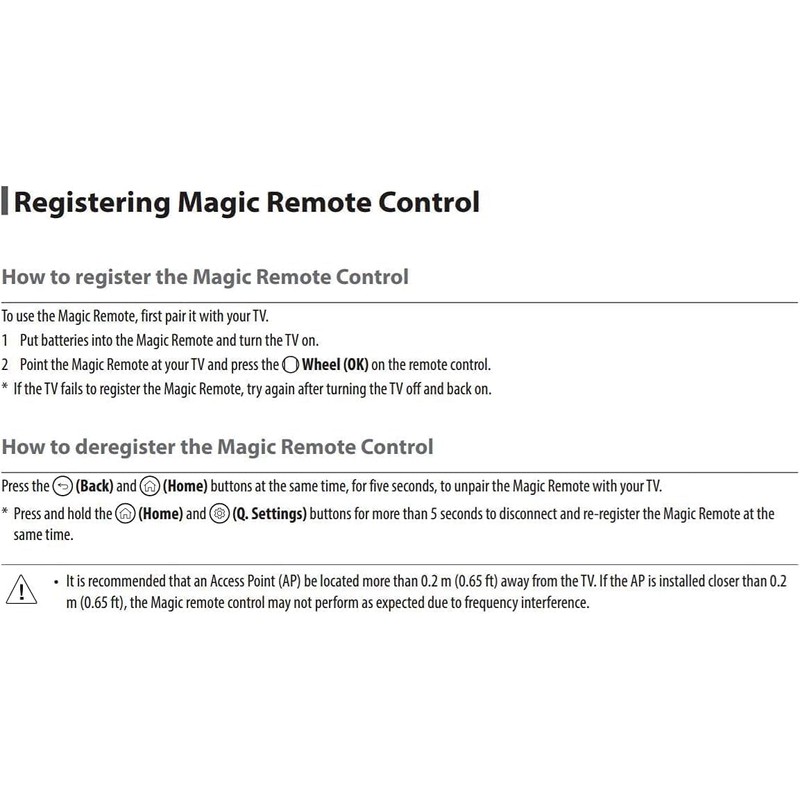 * Press and hold the (Home) and (Q. Settings) buttons for more than 5 seconds to disconnect and re-register the Magic Remote at the same time.