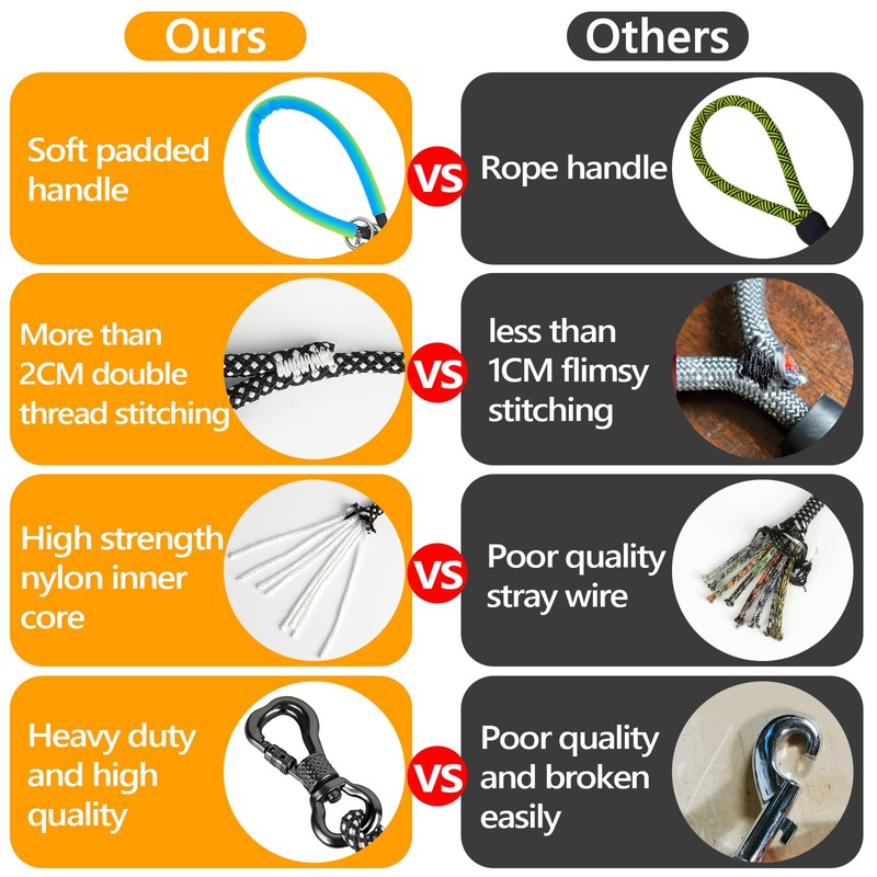 - Soft Rubber Handle: The handle of long leash is made of a soft and sturdy rubber, which is super soft to the touch but resistantis for amazing comfortable shock grip, protects your hand from rope burn, and will afford you and your dog many enjoyable walks together hassle-free.