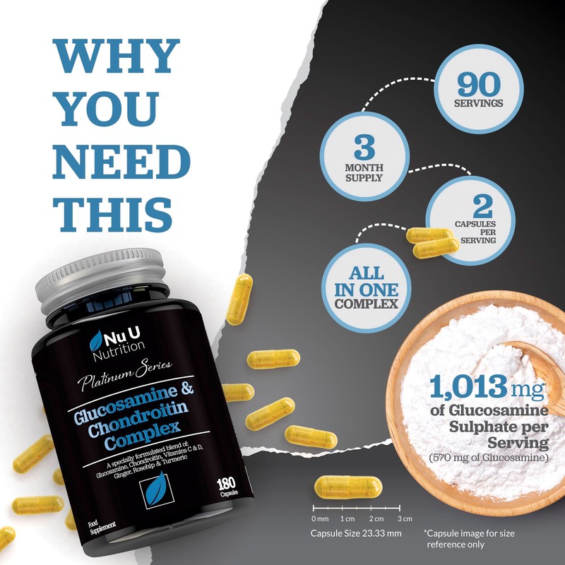Nu U Nutrition Glucosamine and Chondroitin High Strength Complex - 180 Capsules - with Turmeric, Ginger, Rosehip, Vitamin C & D - Joint Care Supplements for Women & Men - Made in The UK - Nu U Nutrition