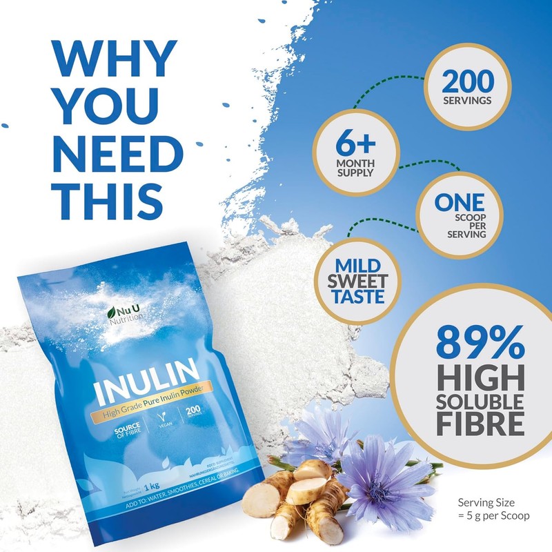 Nu U Nutrition Inulin Prebiotic Powder (1kg) – High-Fibre Fructo-Oligosaccharides (FOS) from Chicory Root, 200 Servings, Vegan & Gluten-Free, Natural Digestive Support