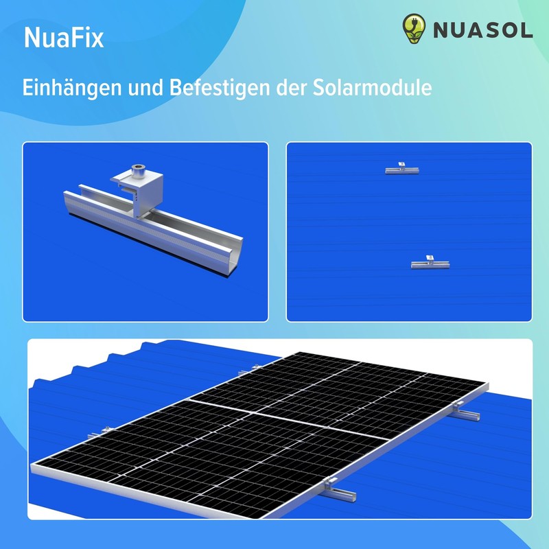 - Everything included: You will receive an extension set for the NuaSol trapezoidal sheet roof mounting kit and can expand your system with other solar modules. Contents: 2 mounting rails (200 mm), 2 centre clamps and 6 wood screws.